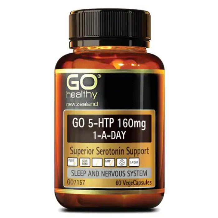GO 5-HTP 160mg 1-A-DAY a superior Serotonin support. 5-HTP is an important natural ingredient derived from Griffonia simplicifolia seeds. 5-HTP supports the healthy production of serotonin in the brain. Serotonin is produced and stored in the brain and when released creates a feeling of well-being, supporting good mood. Healthy levels of 5-HTP are essential for healthy sleep patterns as well as calming and soothing the nervous system. 5-HTP can help in cases of binge eating, food cravings, depression, anxiety, low self esteem, loss of interest and pleasure in usual activities, sleep disorders, migraines, PMS