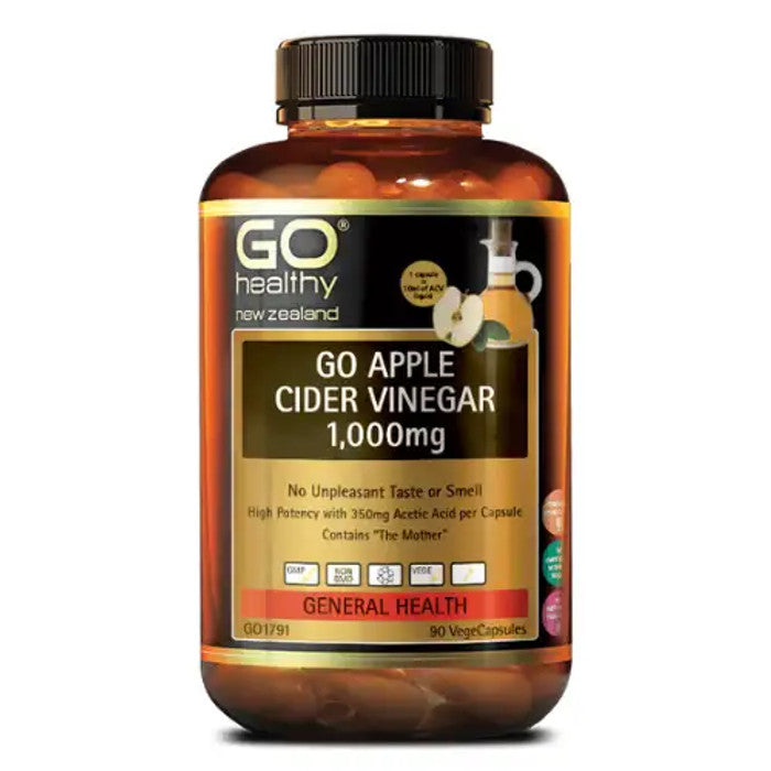 Go Apple Cider Vinegar 1,000mg is made from naturally fermented apples, and supplied in the convenience of a VegeCapsule. This means you can enjoy all the goodness from Apple Cider Vinegar, without the unpleasant taste or smell, plus as an extra benefit, is kinder on the teeth. Apple Cider Vinegar is often recommended by Healthcare Practitioners as a tonic to support general health and wellbeing. Acetic Acid is the active compound in Apple Cider Vinegar and is supplied in a high amount of 350mg per VegeCapsule, helping to provide greater health benefits and support digestive vitality, aid in detoxification, support pH balance in the body and healthy blood sugar balance. Just one easy-to-take VegeCapsule dose is equivalent to 10ml of Apple Cider Vinegar liquid.