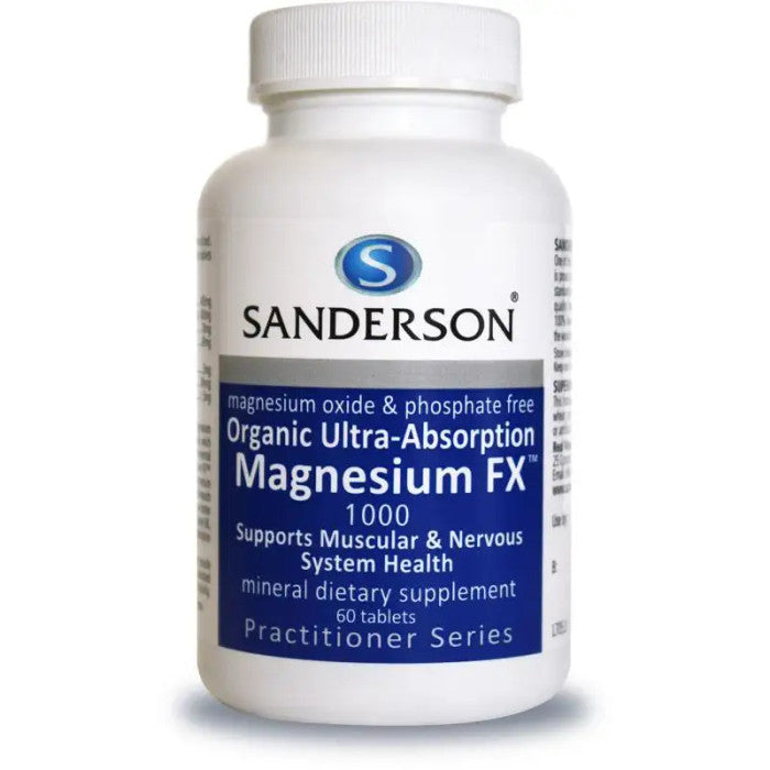 Sanderson Organic Ultra-Absorption Magnesium FX is a combination of magneium citrate, magnesium aspartate, magnesium oratate and magnesium amino acid chelate. Research has shown that these organic forms are better absorbed by the body than any inorganic magnesium such as oxide or phosphate. The added VitaminB6, Vitamin D and Selenium also help the absorption and utilazation of magnesium. Magnesium may be useful for healthy heart function, muscle relaxation, sleep, nervous system balance and PMS .