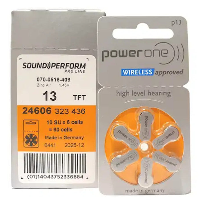 Sound Perform size 13, Zinc Air Hearing Aid Battery 1.45V, 6 batteries per card, 10 cards per box.