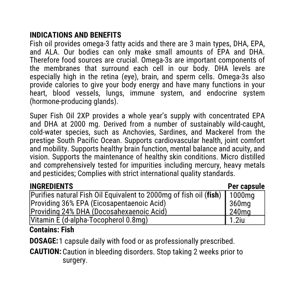 Super Fish Oil 2XP Omega 3 is a high potency omega-3 fish oil providing concentrated EPA and DHA in an easy-to-swallow daily capsule.