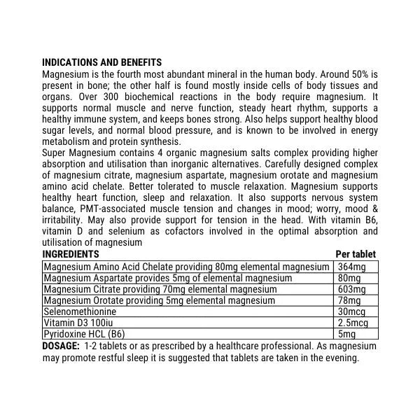 Gold Health Super magnesium is a combination of magnesium citrate, magnesium aspartate, magnesium orotate and magnesium amino acid chelate. Research has shown that these organic forms are better absorbed by the body than any inorganic magnesium such as oxide or phosphate. The added Vitamin B6, Vitamin D and Selenium also help the absorption and utilization of magnesium.