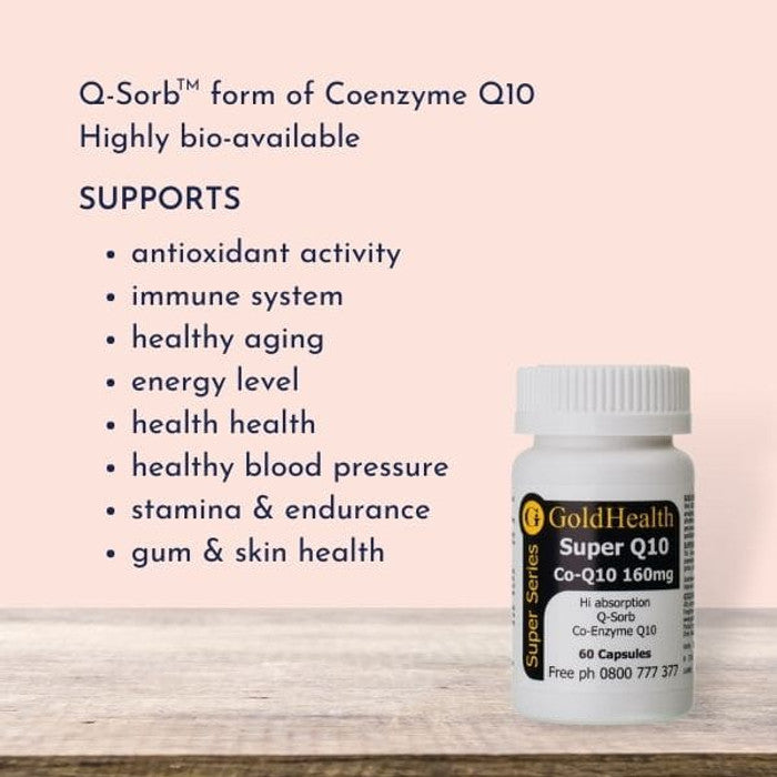 GOLD HEALTH uses the highly bio-available Q-Sorb™ form of CoQ10. Co-EnzymeQ10 is an essential component of the mitochondria - the energy-producing part of the cell. CoQ10 is a potent antioxidant and free radical scavenger; it supports heart muscle health and may support healthy blood pressure. CoQ10 supports in the maintenance of general well-being and supports fatigue. Co-Q10 is beneficial for oxygen uptake and the proper functioning of muscles, thereby supporting stamina and endurance; some athletes use CoQ10 for this reason.