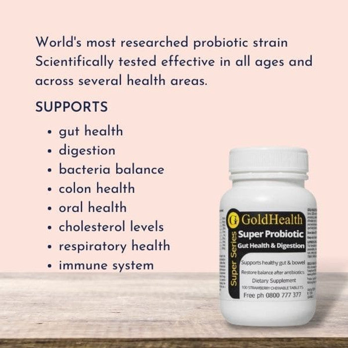 Gold Health Super Probiotic Gut Health and Digestion contains a scientifically validated probiotic strain called BB-12® that has been shown in over 200 published studies to a support a healthy gut and bowel. The 11 billion good BB-12® bacteria in each Super Probiotic tablet have been demonstrated to restore healthy balance to the gut and bowel after antibiotics or other gastro-intestinal upset. Gold Health Super Probiotic XP Restore may also be taken when traveling to support resistance to gastric upset. Super Probiotic is a pleasant tasting, natural strawberry flavoured, chewable tablet.