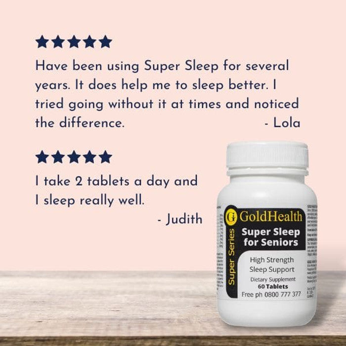 Gold Health Super Sleep for Seniors is a comprehensively formulated herbal combination plus magnesium to support your mind and body to relax into sleep and then stay asleep. Diet and lifestyle are common causes of poor sleep and we recommend regular exercise, progressive relaxation and avoiding or reducing stimulating foods such as coffee, tea, chocolate, sugar etc. Talk to a health advisor about diet and lifestyle changes.