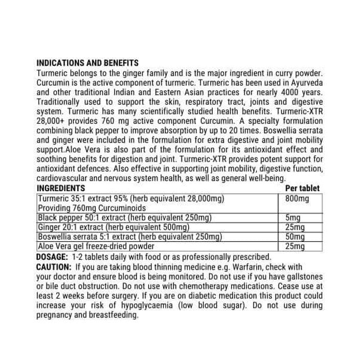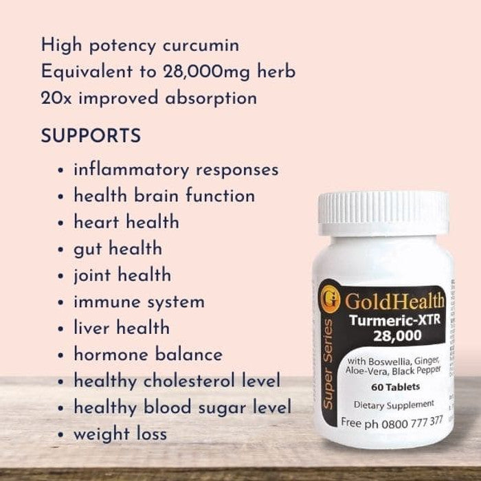 Gold Health Turmeric-XTR 28,000 contains a high-potency extract that provides 760mg of the active component Curcumin. This is combined with black pepper to improve absorption by up to 20 times....