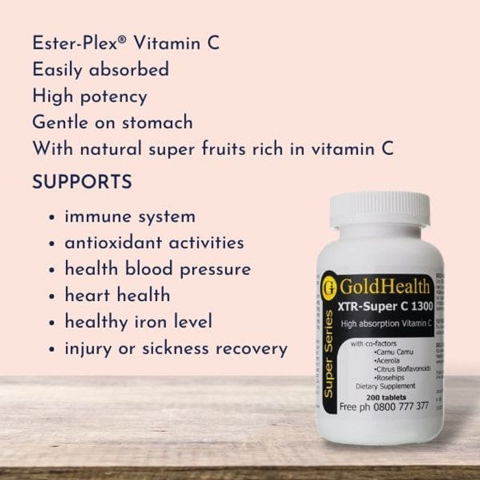 GOLD HEALTH XTR Super C 1300mg vitamin C is a very high strength, easy to swallow vitamin C which contains the same natural metabolites as our chewable product to ensure optimum bio-availability to the body so that the vitamin C is absorbed better than ordinary vitamin C. The vitamin C in Ester-Plex is also buffered to reduce the chance of gastric upset. GOLD HEALTH XTR Super C 1300mg also contains natural fruit co-factors rich in vitamin C including Acerola Cherry, Citrus Bioflavonoids, Rosehips and Camu Camu. Vitamin C is not made in the body and has to be taken in food or supplements.