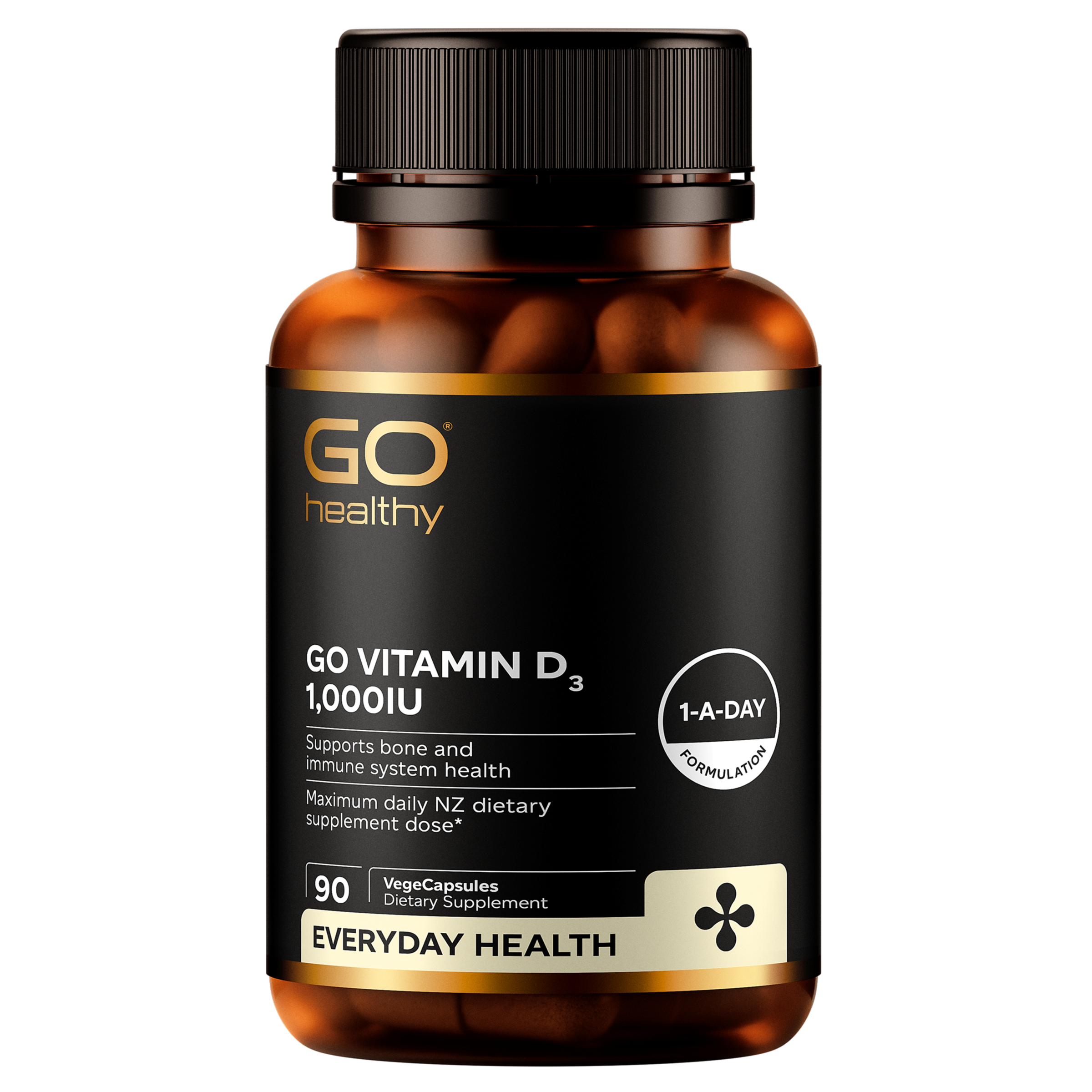 Go Healthy Vitamin D3 1,000IU is essential for bone health, immune protection and positive mood.