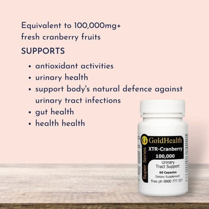 Gold Health XTR Cranberry 100,000 is a practitioner-strength 600:1 herbal extract equivalent to more than 100,000mg of fresh Cranberry fruit. The extract is standardized for levels of Proanthocyanidins to ensure consistent quality and efficacy. The very high potency extract also enables the vegetarian capsules to be small and easy to swallow.