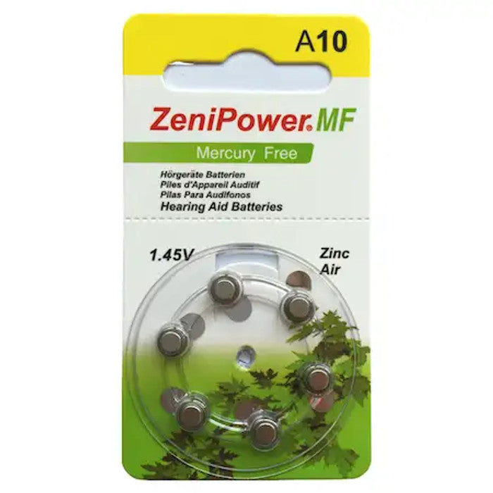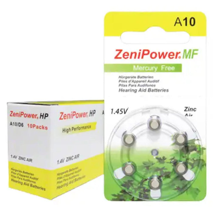 Zenipower High Performance Model 10 Hearing Aid Battery 1.45V, 6 batteries per card, 10 cards per box.