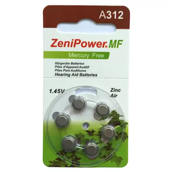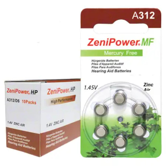 Zenipower High Performance Model 312 Hearing Aid Battery 1.45V, 6 batteries per card, 10 cards per box.